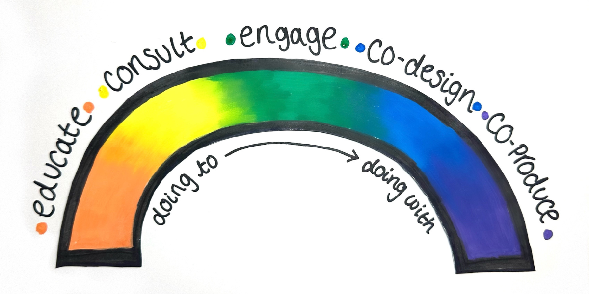 Our team focuses on "doing with", not "doing to". We follow the co-production rainbow.